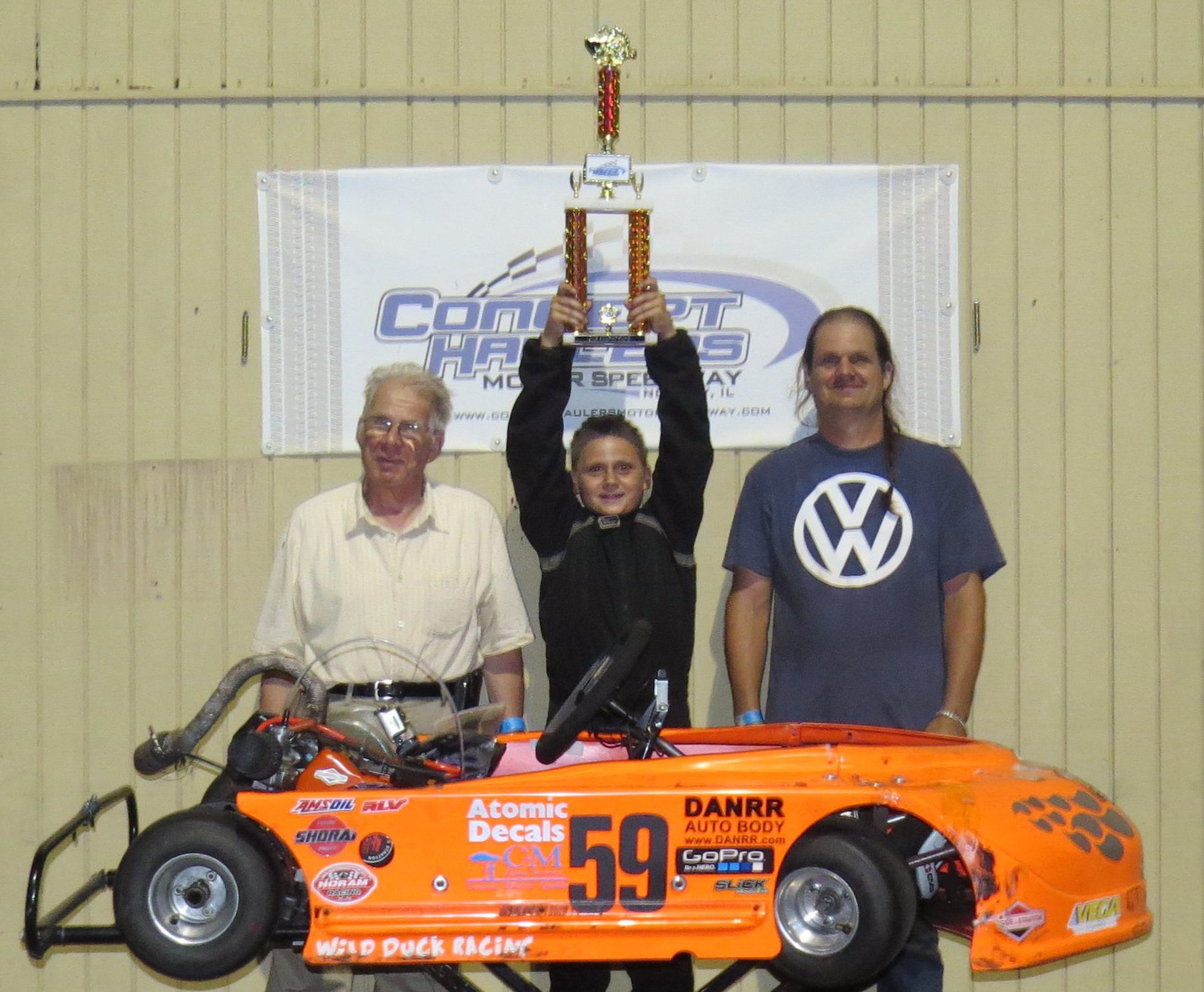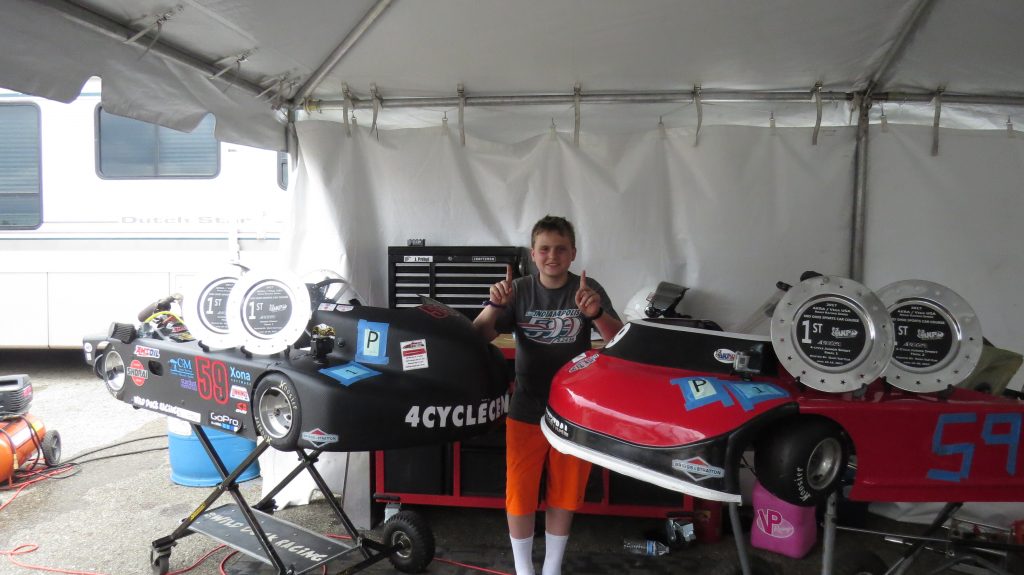 In his first race on Saturday the problems continued. His sprint kart left with a great start and his competition had motor issues and started half a minute after Jason left. The other driver was in a road kart and ran laps about 4 seconds faster. Nearly halfway through the race he was getting close enough to start thinking about passing Jason, when Jason’s kart threw the chain. Due to a bit of luck, the other kart broke down too and stopped 50 yards behind. Jason was in the lead in the last counted lap which gave him a lucky win. They had a nice chat while waiting for race to end pickup. The afternoon race in the road kart was more interesting. He had 3 other drivers to contend with and got a great start but the others missed the green and started many seconds behind. Jason led the race and built on the already large gap, sealing the second win of he day.