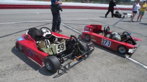 We arrived Friday morning for a day of practice. Jason need to learn this track, while still getting used to his road kart. The sprint kart still needed to be buttoned up after replacing the nerf bar and have the new body panel put on. In the first practice session Jason went out in his sprint kart and promptly broke down after the first lap. Upon his return on the trailer of shame, I found no oil in the motor, a scored tire from a body panel screw, and the frame was also cracked. That left him to run in his road kart for most of the day, which thankfully was holding together and running nicely. Once again Marty Murray had his welder out and fixed the sprint frame, I put the spare motor, and spare tires on by late afternoon it was on the track for shake down. Both karts were running pretty well and did not require much tuning. Only thing left to do is race and see where we stack up against the locals.